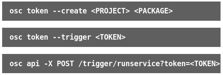 OBS 2.5 provides an API to create authentication tokens to allow the execution of source services. That means you do not have to use your secret login credentials for this, which makes it easy to hook the OBS into aps like github.com for your continuous integration/delivery needs. Check out an example of this 2.5 feature on our blog and make sure you read the chapter in our reference manual on this topic.