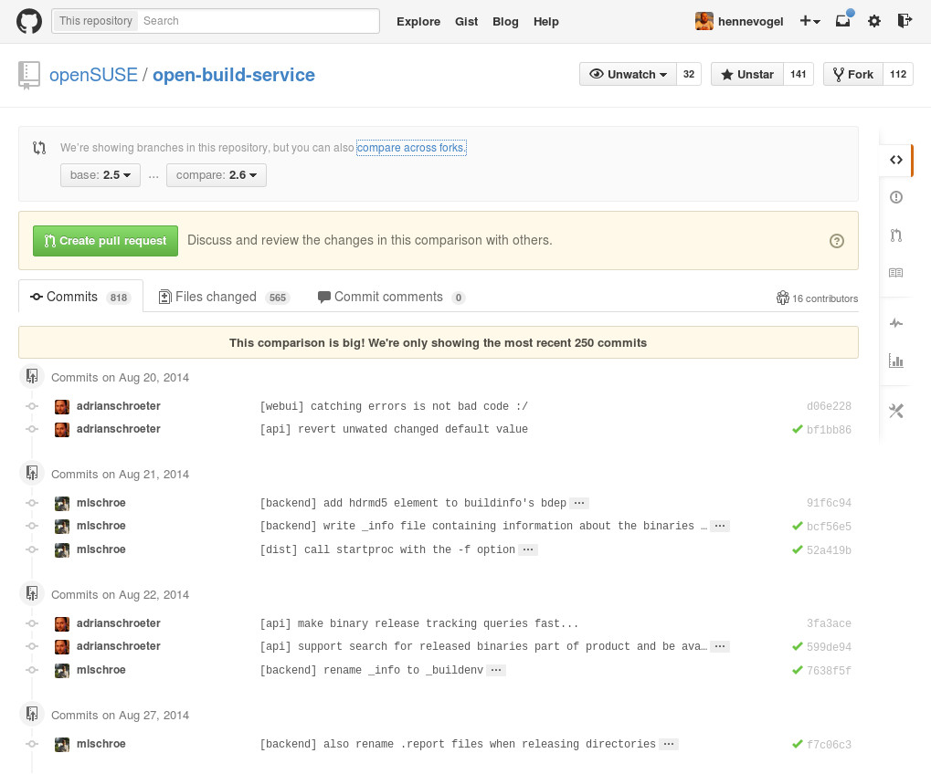 Another year, another release. It's time for the Open Build Service Version 2.6! This release very much focuses on bug fixing. Since OBS 2.5 there have been over 800 commits by 16 contributors, changing 565 files with 7.000 additions and 4,550 deletions. But don't despair we did not only fix bugs, two large features also made it into this release. We worked on the collaboration features of the OBS, requests now support priority and have a better history and we have added support for building Debian live images.