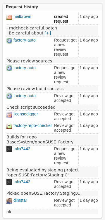 Requests, which are the way people submit and evaluate changes to each others projects in OBS, now have a priority so all parties involved can signal the weight and urgency they give their changes. This is especially useful for larger projects that handle hundreds of requests or projects that sometimes have very urgent changes, like security updates for distribution maintenance channels. Another feature we have added to requests is a history of it's reviews. It's perfectly understandable now how a request got into the state (accepted, declined, under review) it is in. Additionally the requests history elements now have a finer granularity, which enables us to display them more flexible.