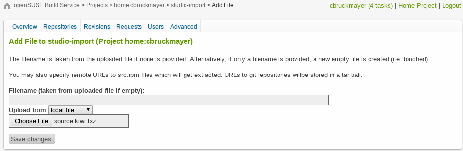 Click on Add file and select source.kiwi.txz from your download directory to import your SUSE Studio configuration into OBS.