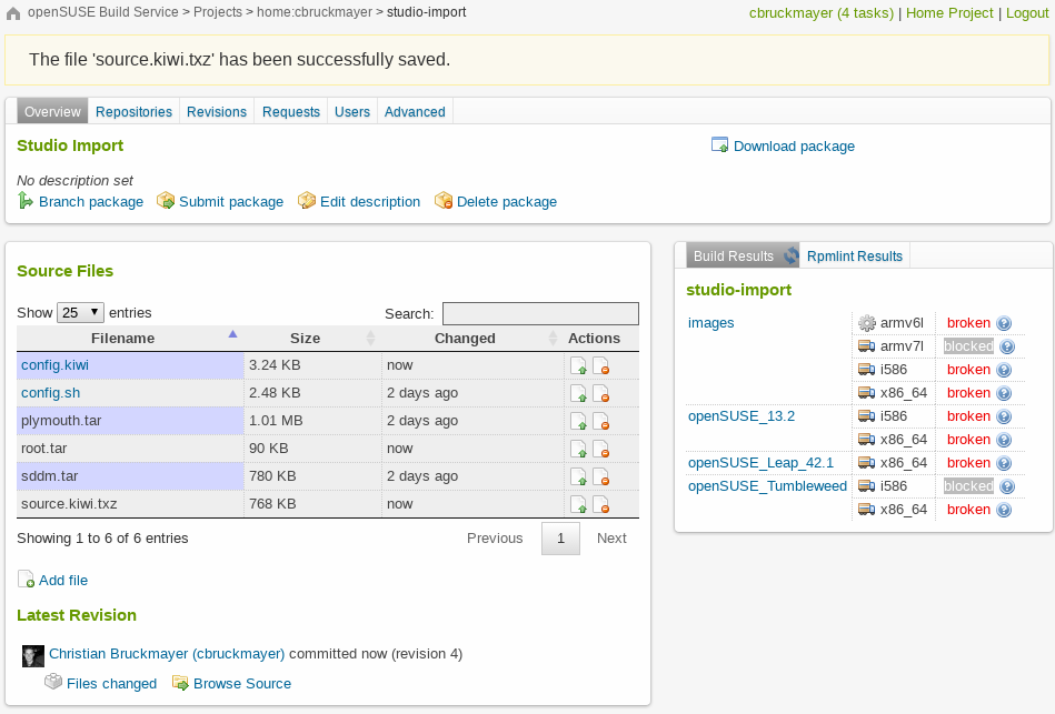 You all know the amazing SUSE Studio and love how it abstracts the complicated process of appliance building. However, it lacks several essential features like an integration into your continuous integration workflow or automatic rebuilds on updates. If you have followed our recent blog posts then you may have noticed that we currently work on a better integration of appliance building in the Open Build Service. This blog post will show you how you can export your appliance from SUSE Studio and import it into the Open Build Service to benefit from these features.