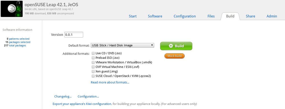 But OBS offers more! SUSE Studio uses only a small subset of Kiwi, with the help of OBS you can make use of the full feature set. Similiar to GitHub and SUSE Gallery, OBS gives you the ability to collaborate with other appliance maintainers. Ever wanted to build appliances for your Raspberry Pie? While SUSE Studio only offered building 64-bit appliances, with OBS you can now build many other architectures including ARM or s390.