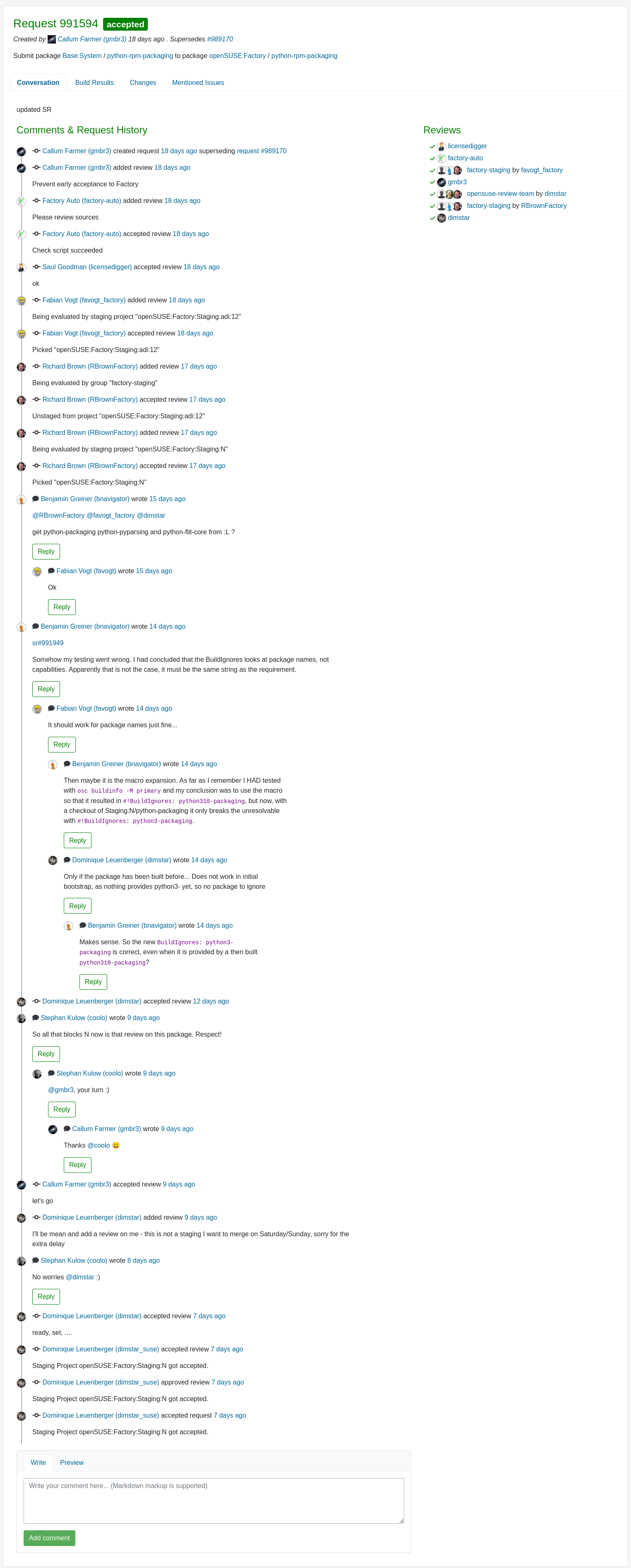 There is a lot going on when you collaborate on changes in the OBS, especially in the “default” case of proposing code changes to packages. You want to know what is affected and how, why the change was proposed, who is involved, what needs to happen next and what do other people think about this change. The current page puts all of this in front of you at once. A lot of information to digest with little focus.