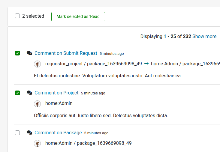 A notification can have different origins. Each notification item includes a couple of lines to help recognize them among the others. You always have the option to click on a notification, which will lead you to the specific section of OBS (request, comment, project, package, ...) with the full details on what caused the notification.