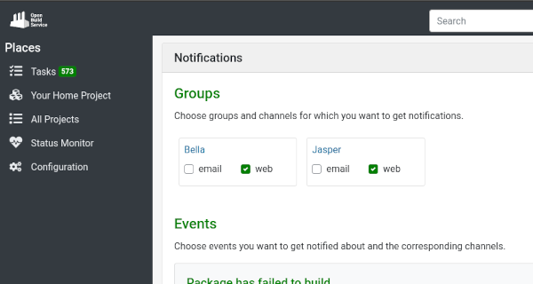 You can get web notifications from events happening to projects and packages where the group you belong to is an owner. Just mark the "web" checkbox in the groups your are interested in.