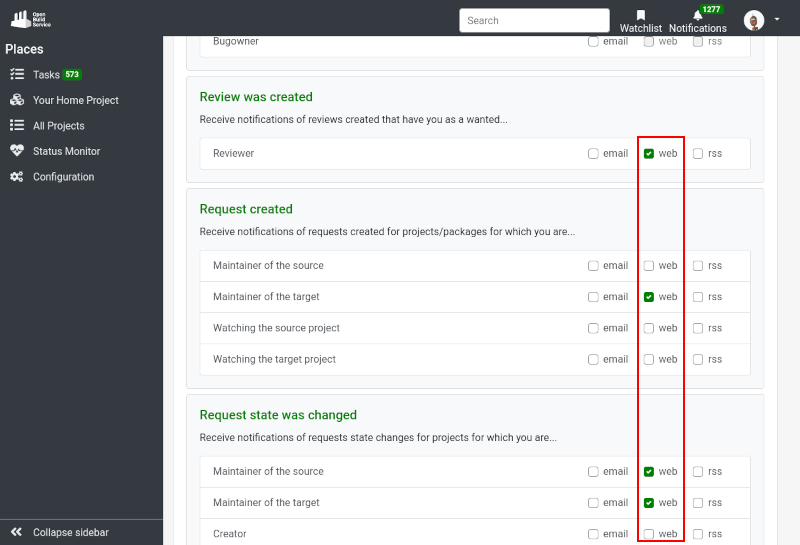On this page, you can configure under which conditions you receive each type of notification (email, RSS, web). Mark the "web" checkboxes to configure what notifications you will receive in the web UI.